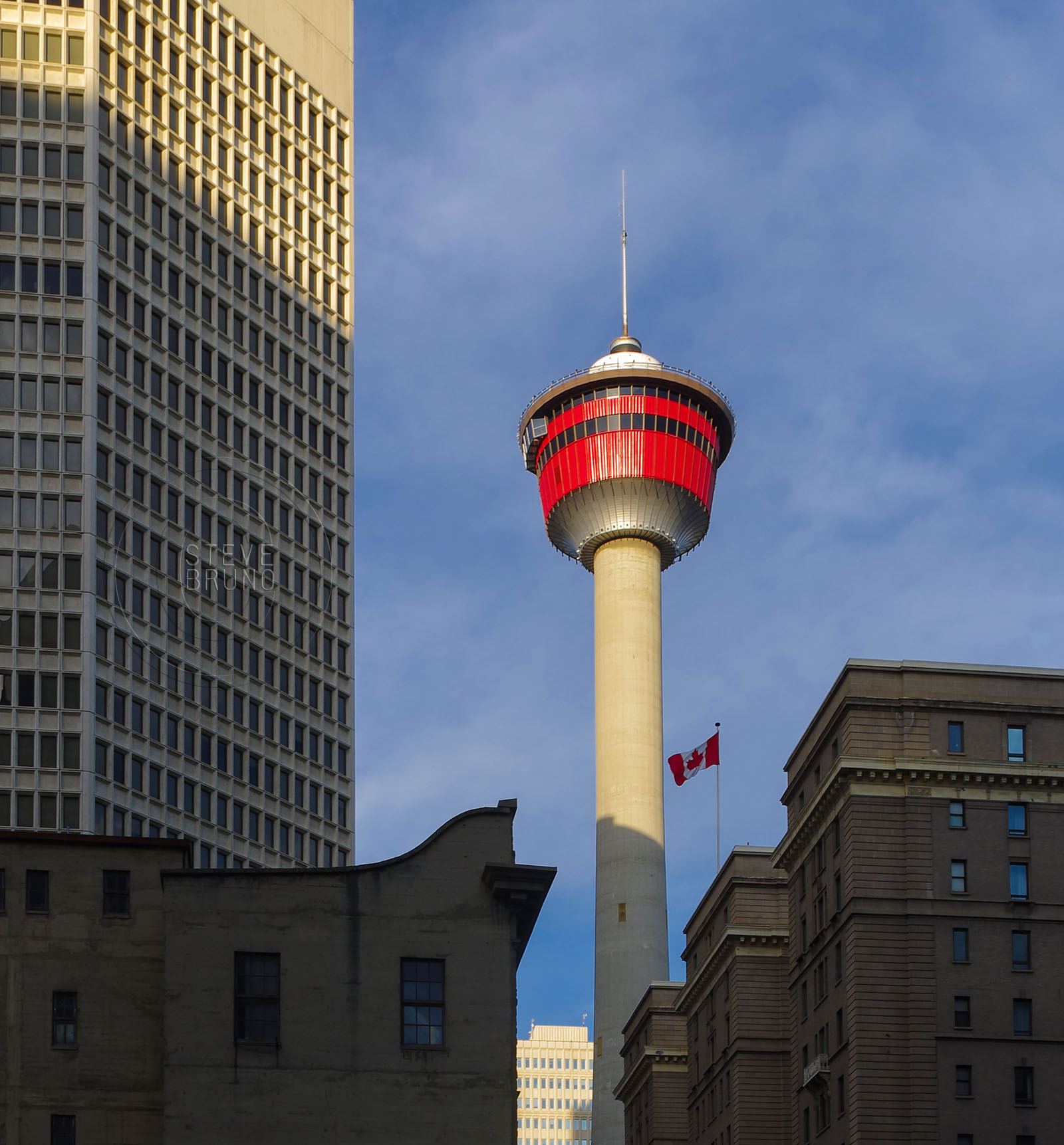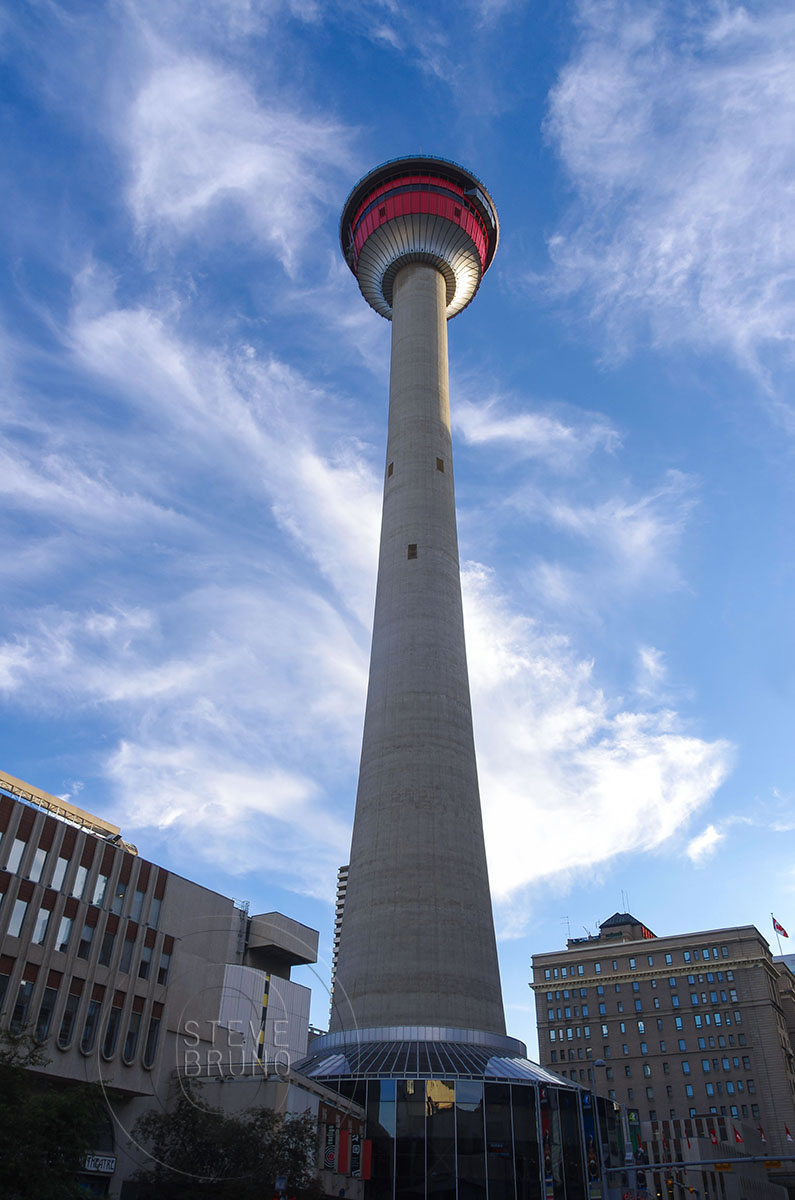 Calgary Tower in late afternoon light from down the street a couple blocks, photo by Steve Bruno