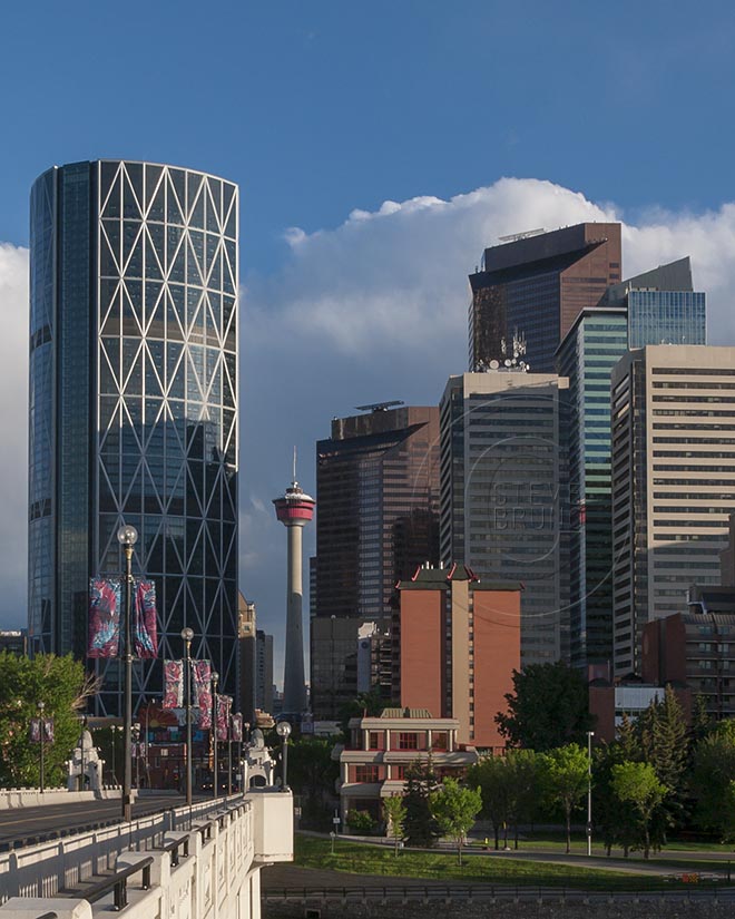 The Calgary Tower, tucked into the Calgary skyline, photo by Steve Bruno