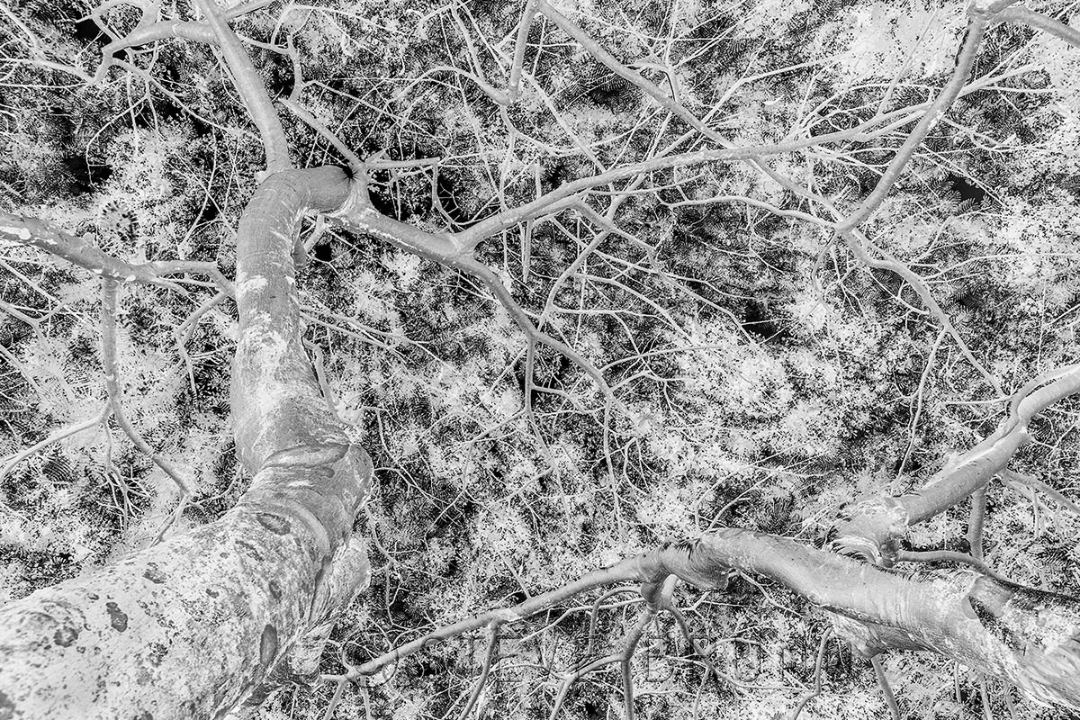 This is one of my favorite shots from Hawaii, but it didn’t come from some spectacular wilderness setting. In the property next to a gas station, there was an interesting group of trees. This was taken looking up from underneath two of them, but closer to the one on the left. I love the patterns of the branches reaching skyward, and in color the contrast of the branches against the lush green with red flowers makes this work. When I converted it to grayscale, it just fell flat. And then I thought, what’ll happen if I click on Inverse? The network of branches came back to life!