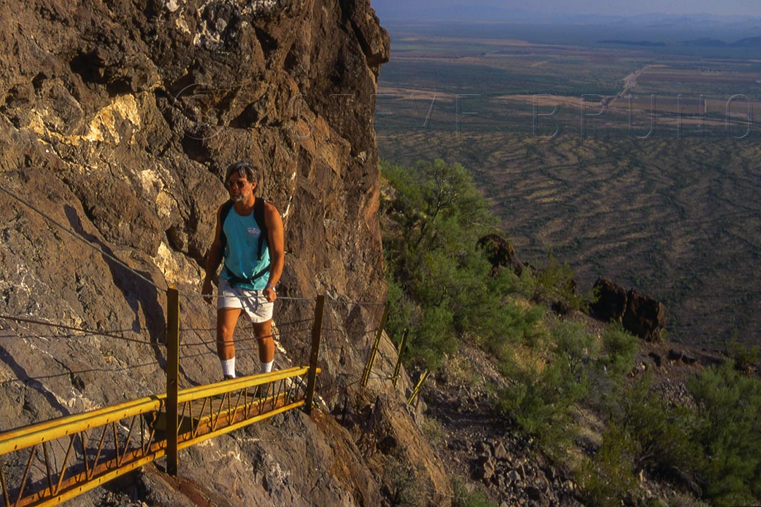 Hiker on the built-up portion of the summit trail to Picacho Peak, Arizona by Steve Bruno