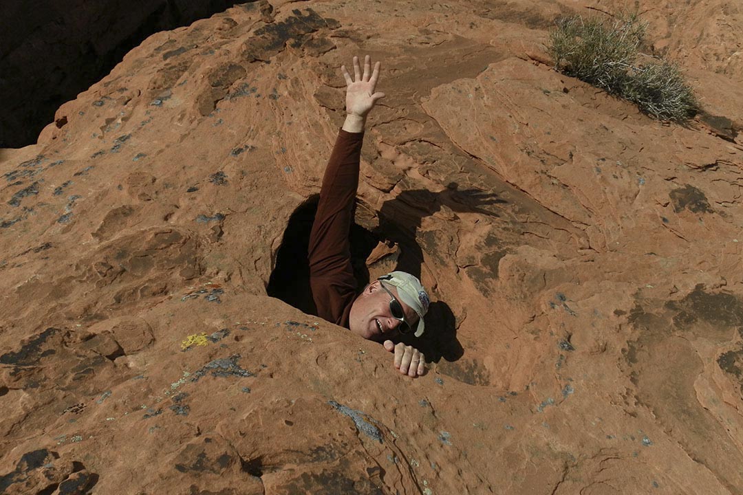 Hiker swallowed up by sandstone manhole, Valley of Fire State Park, Nevada by Steve Bruno