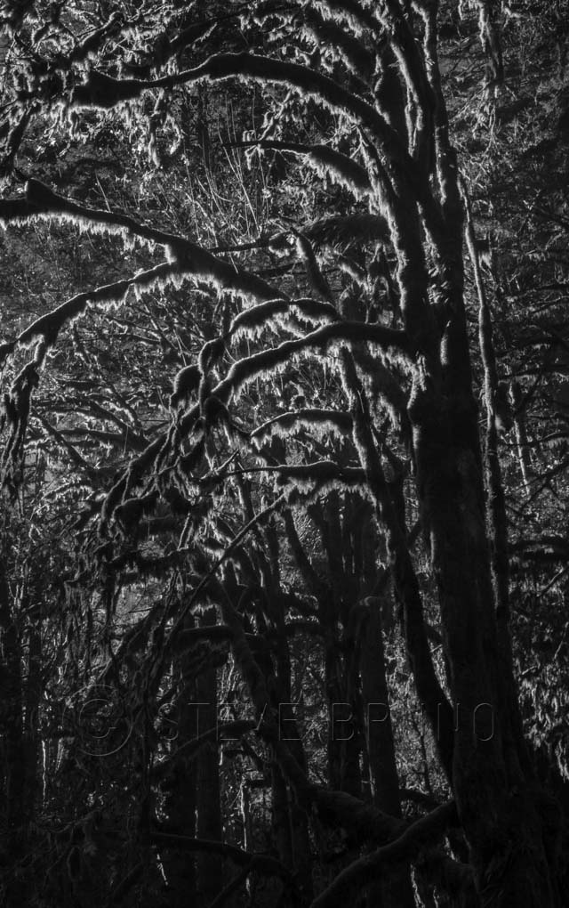 Dark forests can be creepy, and one of the darkest I ever came across was in Hawaii, of all places. I didn’t take any photos there, but this one, with the moss hanging from the branches, is from last year in Oregon.