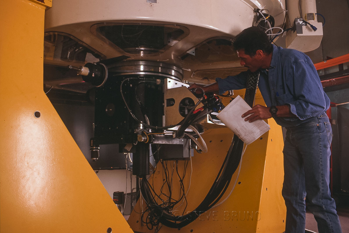 Astronomer checking on equipment on one of the telescopes on Mount Graham, Arizona. Photo by Steve Bruno