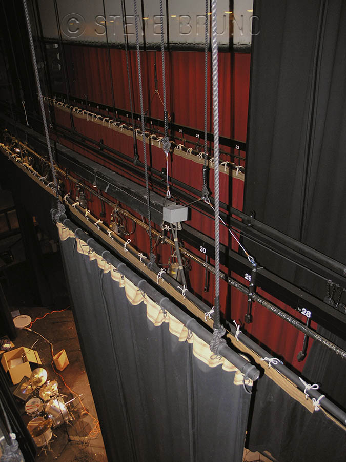 Once on the elevated platform, all the ropes are tied off here. The sandbags are the counterweight for the appropriate curtains or sets.
