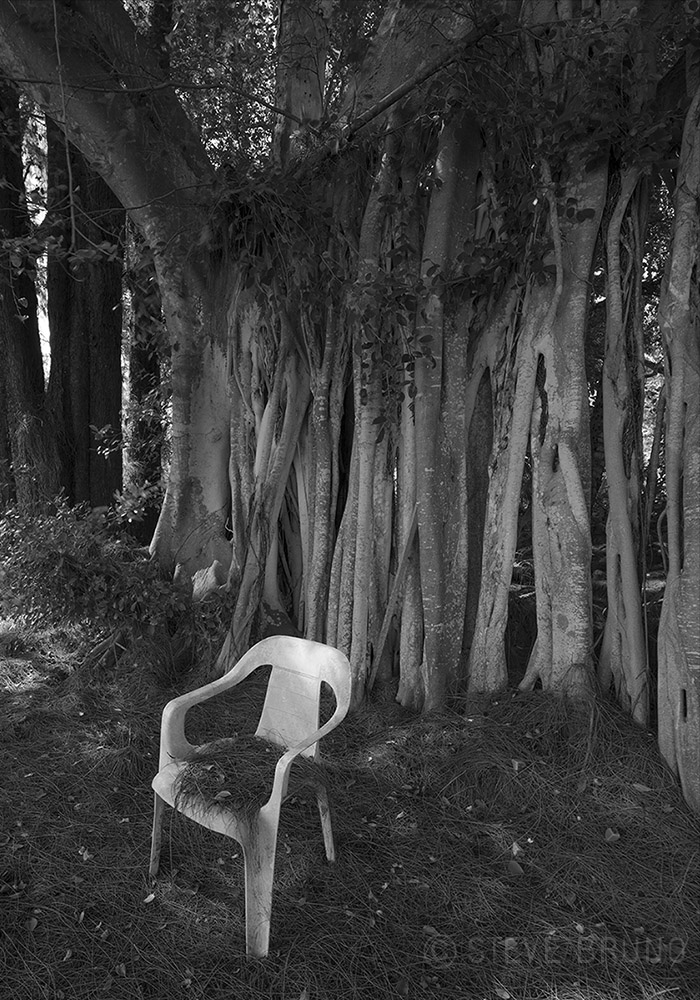A couple days ago, I was returning from a beautiful morning along the north side of the big island in Hawaii.  I drove by this setting close to the road, which didn’t appear to be part of anyone’s front yard.  I was fascinated with the shapes and textures of the tree’s root system, and it’s bleached appearance.  I started to remove the chair, but took a few images with the chair in place first.  Clearly, with that much pine straw covering the seat, as well as how deeply the feet were covered, it had been a while since this chair had seen some use.  I took a few more photos after I removed the chair, but was more intrigued with the ones including the chair.