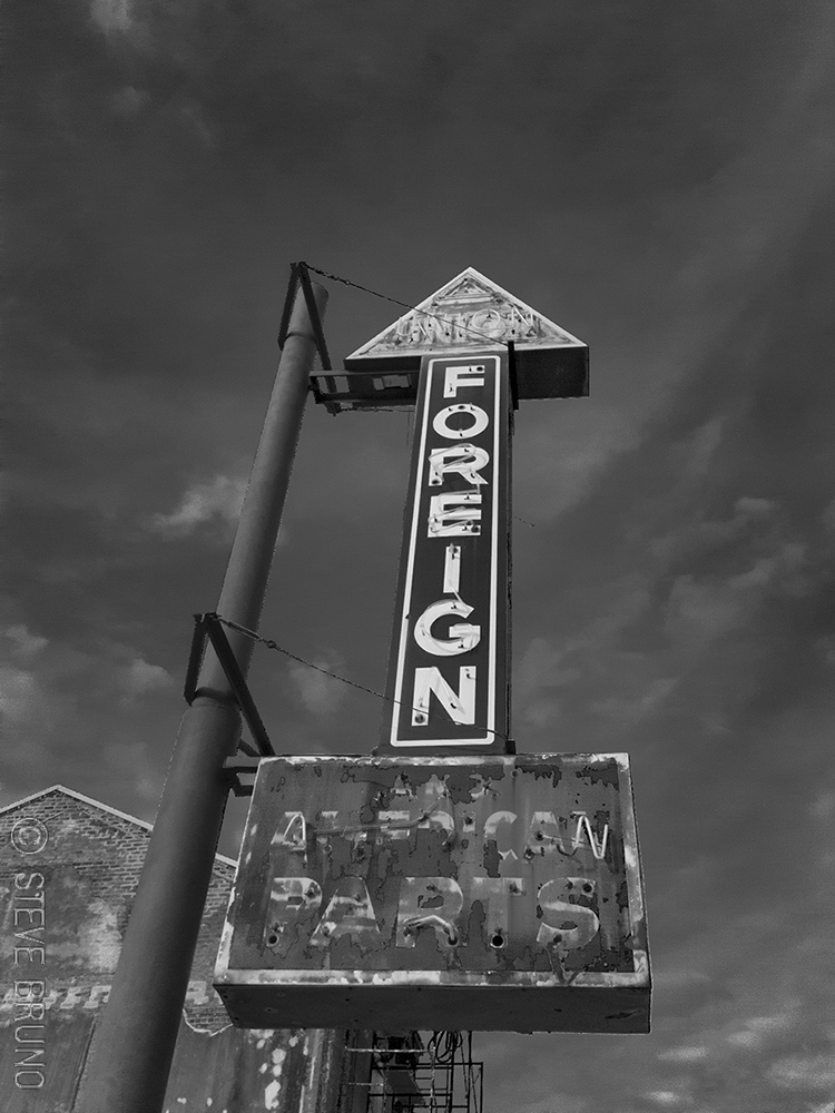 I was going through my media storage the other day, and came across this shot from a trip to New Orleans a couple years ago. I never got around to putting this one out, so here it is finally. It must have been quite a sign when it worked, and this was definitely the more preserved side of the sign. Only a few neon tubes remain and the paint has long since faded, but from top to bottom it reads, “Union Foreign American Parts”. Sounds like an identity crisis, or they were just trying to appeal to everyone.