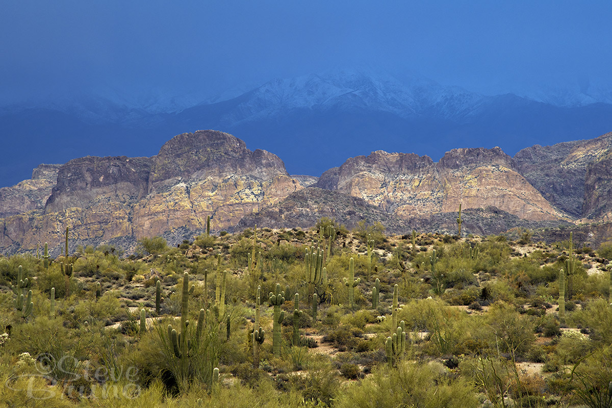I always liked this photo in color, and never really thought of it in black and white until I was playing around with some files last week. Some effects can be achieved in Photoshop, and sometimes you just have to wait for the right moment to press the shutter. I’m sure I’ve talked about it before. I call it Mother Nature’s dodge and burn. A storm was clearing over the Superstition Mountains just as it was getting late in the day. Shafts of light were sliding around here and there, then a large opening in the clouds allowed for the Saguaro cactus forest to be illuminated while the cliffs above were waiting their turn.