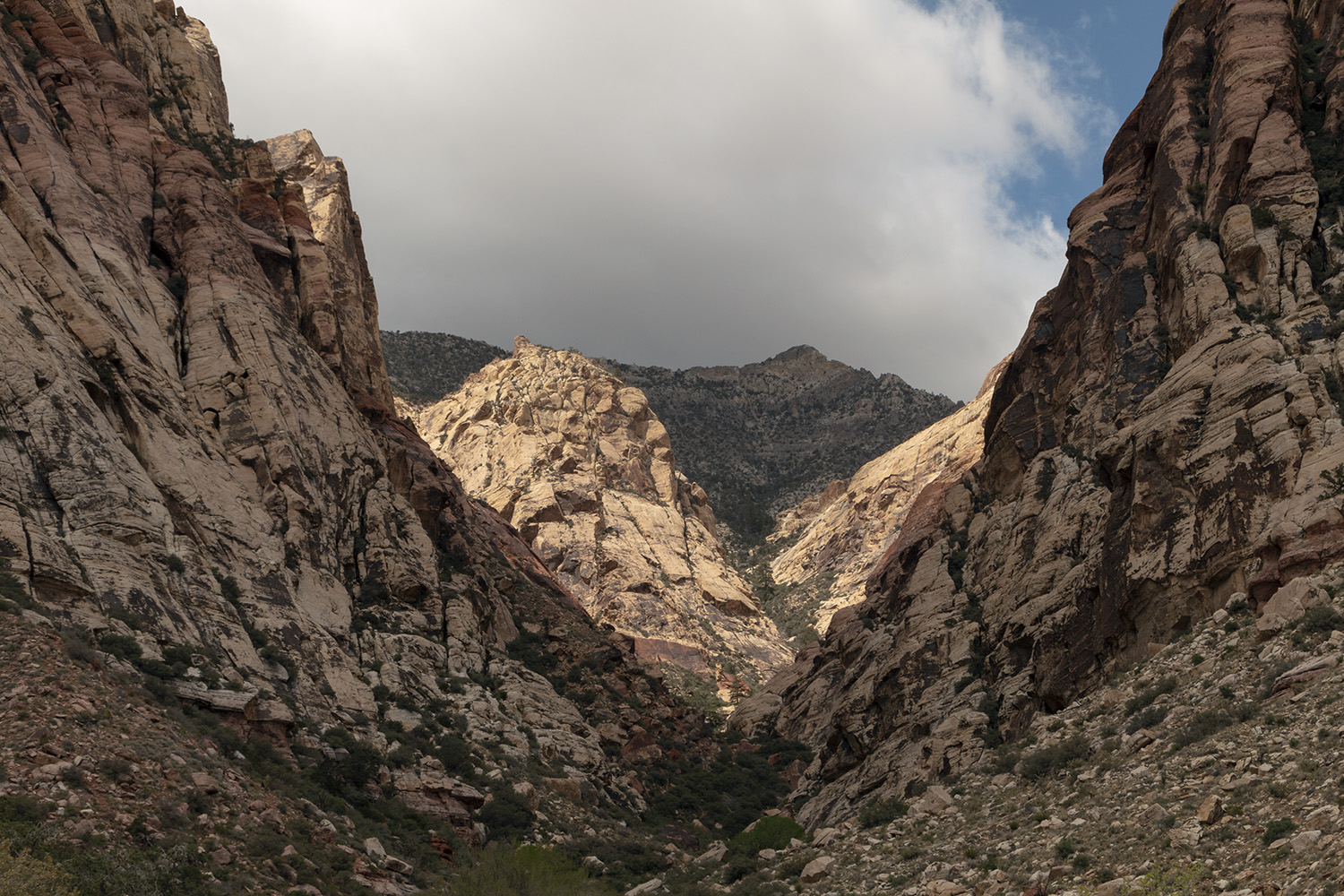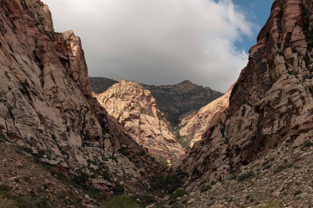 The monsoon season has been a good one this year, but for the most part, appears to be over. Sunny and hot dominates the upcoming forecast once again. We had almost a month straight with cloud cover, many small rains, and some downpours. Sadly, from a photographer’s standpoint, most of the big rains happened at night. There are a couple spots with normally dry waterfalls that have safe access no matter what the weather, and I’ve been wanting to capture those in full force. Two weeks ago, we had a daytime thunderstorm in the right part of town, and I headed out to see some waterfalls. As I got closer, I realized the rain had missed the area I hoped to see, so I kept driving. When I came upon this canyon, I could see a waterfall going. I knew I wouldn’t be able to get closer before the flow ceased, so I had a moderate telephoto lens along for that reason. Errant raindrops were still coming down as well as thunder rumbling from somewhere overhead, without seeing any lightning. Despite that, I could see blue skies about to take over. I took a photo from this same spot five minutes earlier that shows all the waterfalls because of the soft light. When I saw the sunlight coming through, I knew this was going to be a b&w. All those cliffs were still very wet, and in this shot you can still see one waterfall clearly. If you’re seeing this on a larger screen, you might see a couple of the other ones.