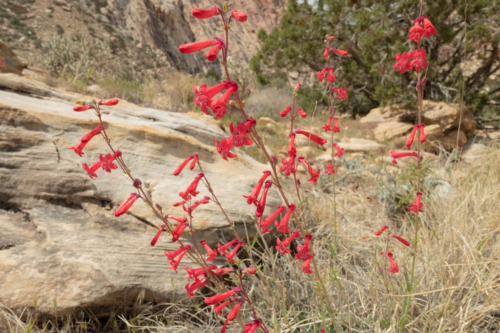 As I mentioned in my last post, we had an unusually nice run of cloudy days and rain this summer which is starting to feel like a distant memory. On one of those days, I headed out expecting to get wet. No, make that I was hoping to get thoroughly drenched. At least, that’s how it looked when I started. Mother Nature changed her mind as she often does, but this day turned out to be fantastic for hiking. The big storm lost its energy and in its wake left a couple hours of heavy overcast, light drizzle, and temps around 78 degrees. Technically, the subject in my photo could be called a waterfall, but that’s a stretch. There were tiny pools at the bottom, and several drops trickling down the wall, and that’s about all you might ever see here. The problem with this location is the lack of drainage to feed enough water over the top, unless of course, you were here getting thoroughly drenched by rain. I’ll keep trying. In the meantime, the contrast of the wet black streak against the sandstone and the soft light made for a nice image. Further up, wet plants and continued soft light made for lots of subjects later that day.