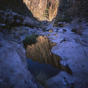 Sunlight at the end of the canyon, reflected in a pool in Boulder Canyon, Superstition Wilderness, Arizona. Photo by Steve Bruno.