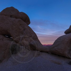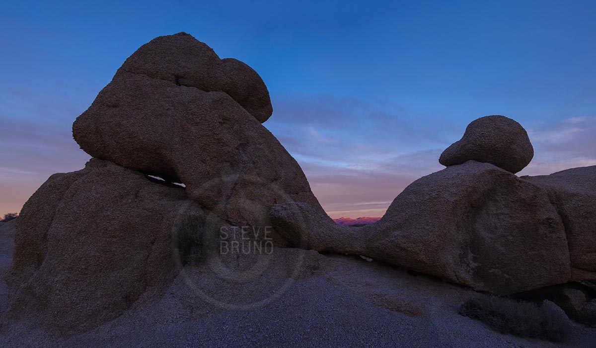 Boulders at sunset, with the sun still hitting the mountains in Arizona. From the Newberry Mountains, southern Nevada. Photo by Steve Bruno.