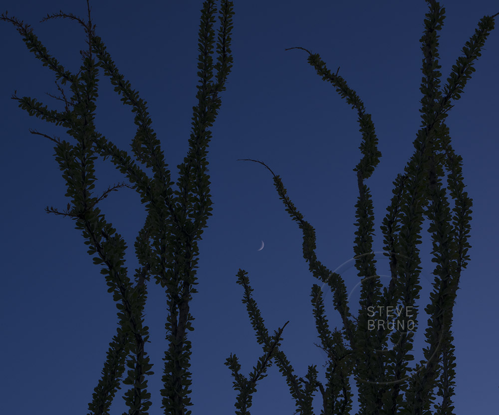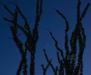 Crescent moon in the skies above an ocotillo plant in the Arizona desert by Steve Bruno