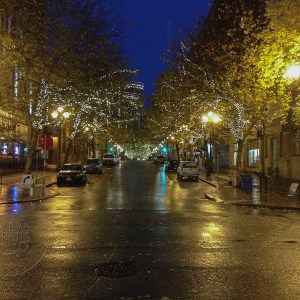 Lighted trees adorn the streets near Pioneer Square Park in Seattle. Photo by Steve Bruno.